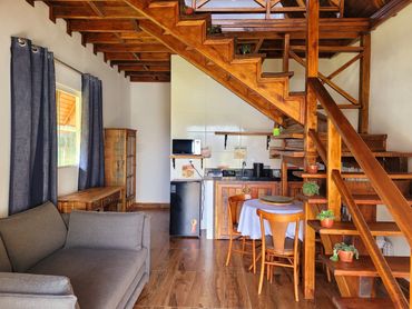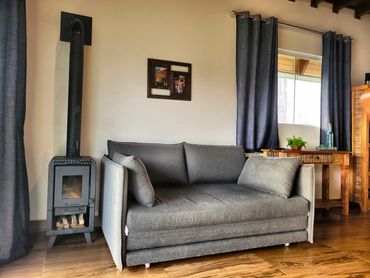 Chalé com 54m2, e tem vista para piscina. Acomodam até 6 pessoas tem cozinha completa com utencílios. Ainda conta com churrasqueira na varanda e calefator à lenha (lareira) e o ar condicionado frio.. Tem TV Smartv e Sky.